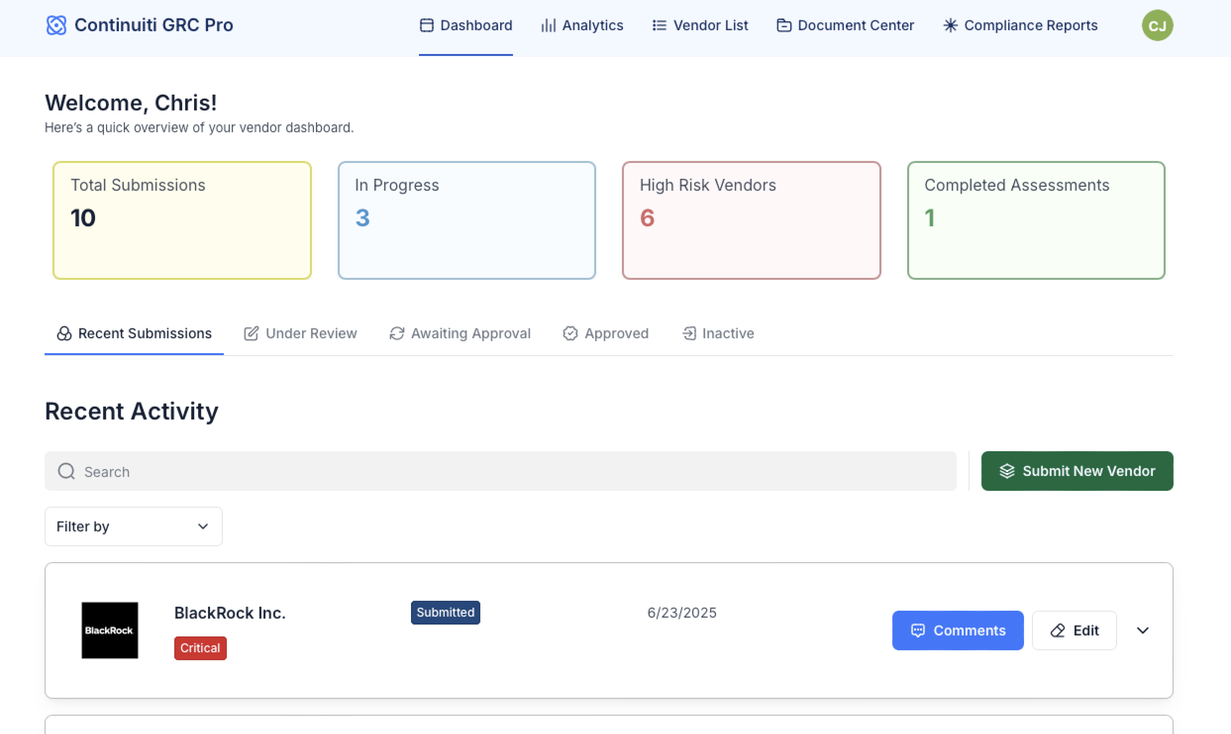Yes. All clients receive access to Continuiti GRC Pro, our client portal that allows you to submit vendors, monitor review status, download completed assessments, and maintain compliance records.